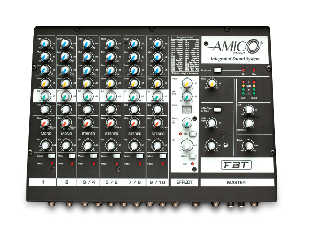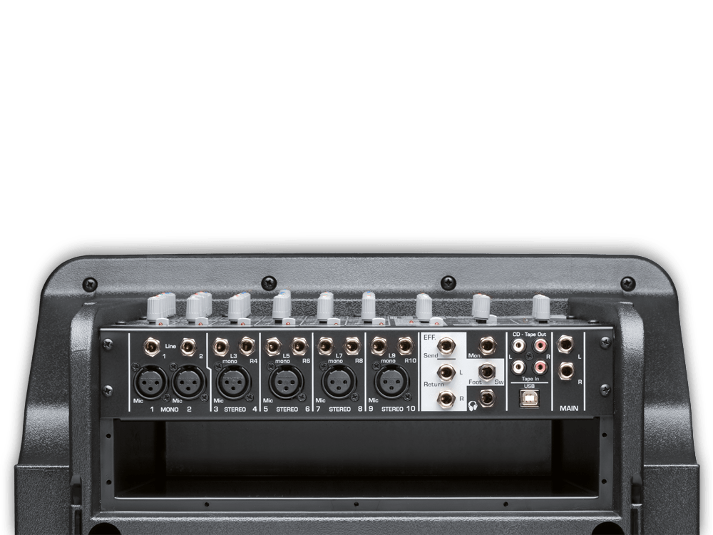 Il mixer a 14 canali con multieffetto digitale a 99 preset e phantom power offre un controllo completo sulle impostazioni audio, mentre il connettore USB consente di riprodurre la musica proveniente dal PC o di registrare l’uscita Master del mixer. Il sistema è dotato di tre controlli di tono, una mandata monitor ed una mandata effetti, nonché di uscite cuffia e master e una mandata monitor ed effetti.