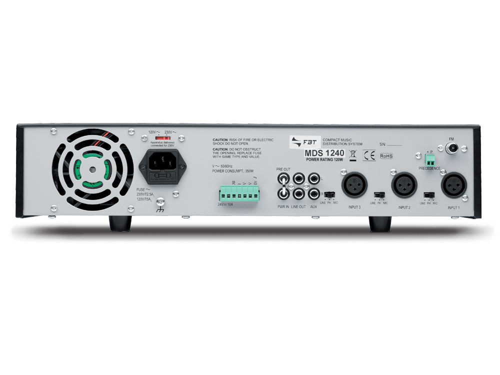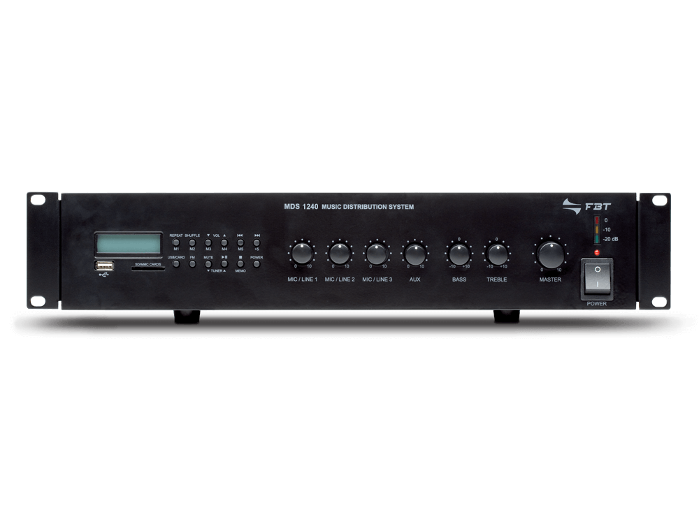 La serie MDS di amplificatori integrati unisce in un compatto chassis metallico tutto ciò che serve per una configurazione rapida e facile. Questa è la soluzione audio ideale per qualsiasi piccola attività commerciale che necessita di un plug and play intuitivo senza l’uso di software o configurazioni complesse. MDS 1240 è un amplificatore monocanale da 240W dotato di 4 ingressi mic/line e un’uscita line, lettore MP3 e modulo sintonizzatore FM. Tutti gli amplificatori dispongono di uscite in potenza per collegamenti Hi-Z e Low-Z
