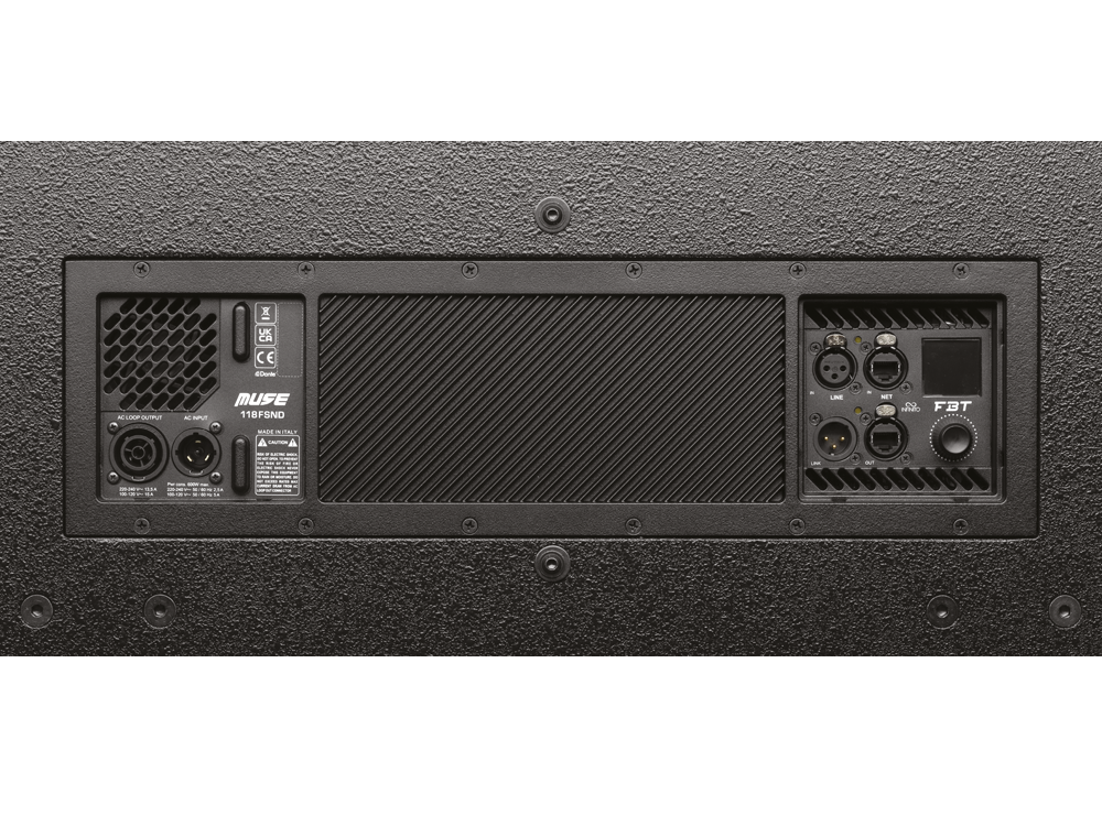 Il MUSE 118FSND è un subwoofer attivo flyable progettato per integrarsi perfettamente con i sistemi line array MUSE 210L, fornendo rinforzo alle basse frequenze sia in configurazioni sospese che a terra. Ideale per tour, eventi live e installazioni di alto livello, offre una risposta in bassa frequenza profonda e coerente in fase, mantenendo dimensioni compatte e compatibilità con il rigging. Il cabinet ospita un woofer B&C da 18″ al neodimio ad alta escursione con bobina da 3.5″, montato in una configurazione ibrida band-pass per ottimizzare la resa e minimizzare la distorsione. Risposta in frequenza: 33Hz – 100Hz. SPL massimo: 140dB. L’amplificatore in Classe D integrato eroga 1600W RMS, gestito da un potente DSP con 3 preset selezionabili dall’utente, inclusi configurazioni standard e cardioidi per un impiego versatile. Il pannello posteriore include IN/OUT XLR bilanciati, selettore rotativo con display OLED per il controllo DSP, e regolazione del guadagno con LED di segnale/limiter.