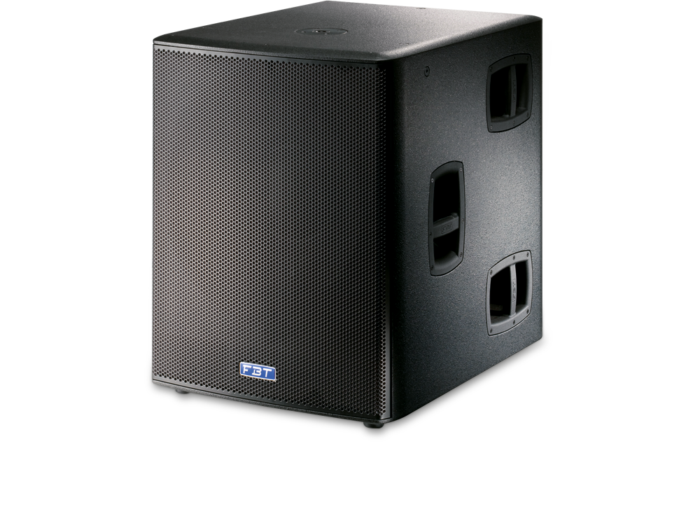 Constructed from 18 mm birch plywood with a scratch-resistant black coating, the cabinet includes eight M10 fly points, an M20 top-mounted pole socket, and two custom FBT aluminum handles. The rear panel features XLR input and link, volume control, preset selection, delay adjustment, phase switch (0°–180°), and ground lift.