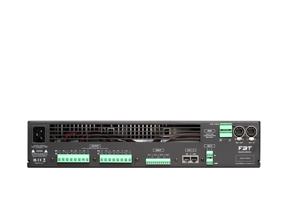 8×1000W at 4Ω – 8×900W at 70V – 4×2000W at 100V BTL