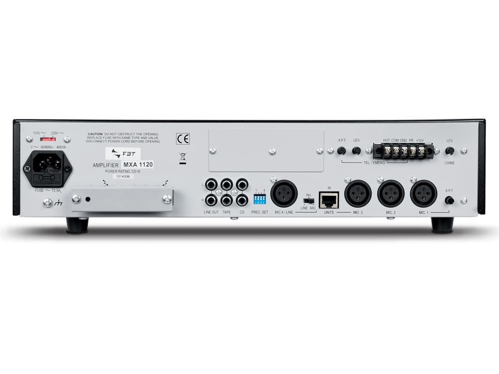 These integrated mixer-amplifiers provide the perfect balance of flexibility, functionality and affordability, combining basic mixer functionalities with a robust single-channel power amplification board. Engineered for versatility and cost-effectiveness, the MXA series is composed of two models with a total power of 60W or 120W in either Hi-Z or Low-Z output configuration. With multiple mic/line inputs, programme selection, basic tones and level management, these amplifiers are designed to adapt to a variety of audio needs, from basic background music distribution to paging or emergency purposes. The clean front panel displaying essential controls only makes these amplifiers very intuitive to manage; each input channel has a dedicated volume control while the main control handles master volume, bass and treble and power switch.