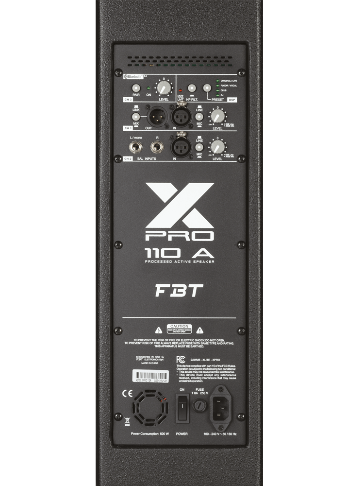 X PRO 110A is a compact active 2-way loudspeaker designed for portable sound, installations, and stage monitoring. It features a 10″ woofer with a 2.5″ voice coil and a 1″ compression driver with a 1.4″ voice coil, mounted on a rotatable 80° x 50° constant directivity horn. The Class D bi-amplification system delivers 1200W LF + 300W HF and achieves a max SPL of 127 dB with a frequency response of 58 Hz – 20 kHz.